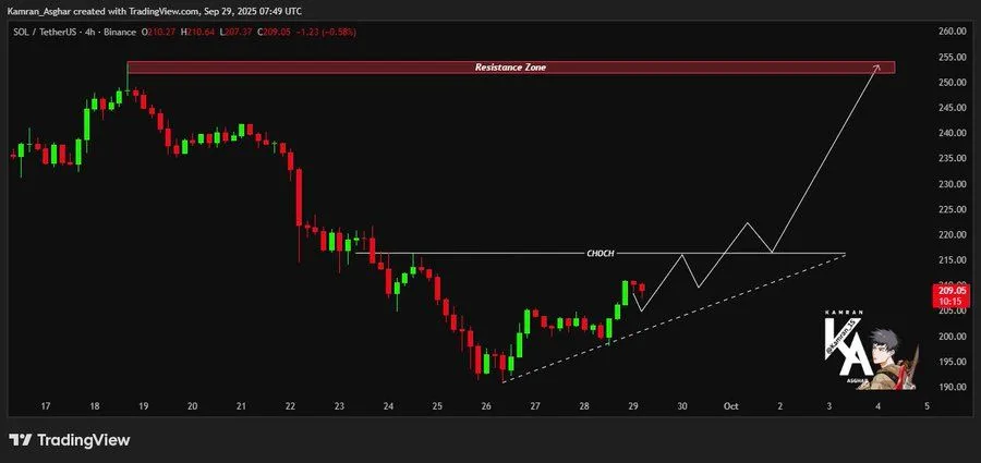 Additionally, 𝐊𝐚𝐦𝐫𝐚𝐧 𝐀𝐬𝐠𝐡𝐚𝐫 notes that SOL has reclaimed structure near $209, suggesting a potential Change of Character (CHOCH). A bullish trendline from recent lows indicates buyers are defending higher prices.