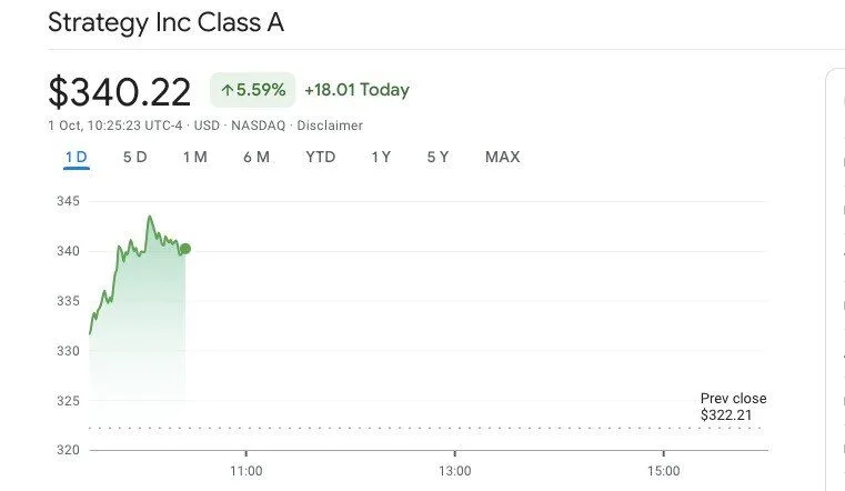 Strategy’s stock shows signs of both volatility and resilience. The daily chart reports a current price of $340.22, reflecting a 5.59% increase today.