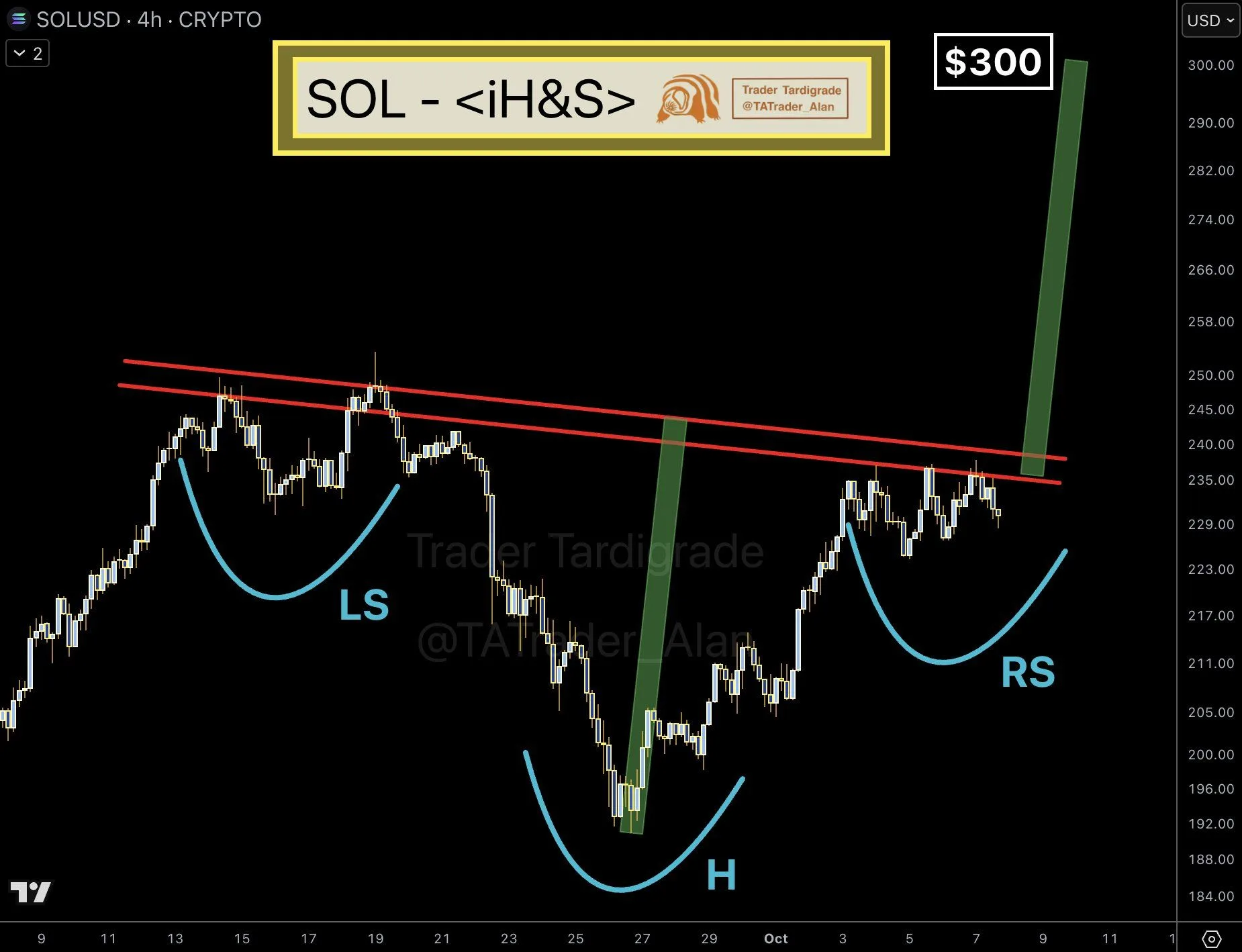 According to Trader Tardigrade, an inverse Head and Shoulders formation on the 4-hour chart signals a potential move toward $300, provided price breaks above $240 resistance.