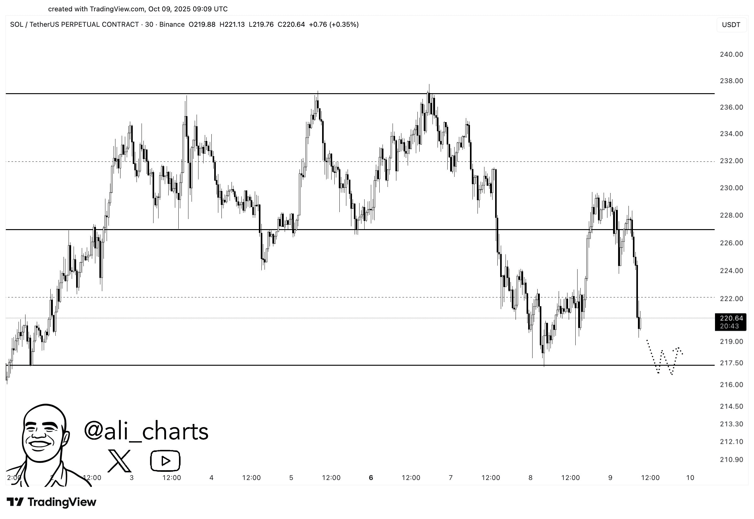 At the time of writing, Solana trades near $221, down 2.9% in 24 hours, with a key support level at $217. Market analyst Ali Martinez emphasized that this level will determine Solana’s short-term trajectory, as a rebound could trigger a “W-shaped” recovery toward $226 and $236. A breakdown below $217, however, may lead to deeper corrections near $212.