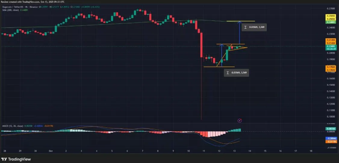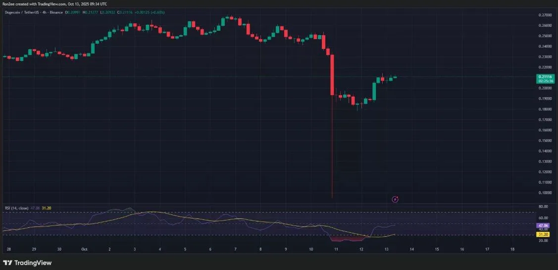 Dogecoin experienced a 17% increase on Monday, reaching an intraday high of $0.21, recovering from a sharp decline that pushed the meme coin to a three-month low. The token had lost 33% of its value in the last week and hit a bottom at $0.18 on October 12. Despite Monday's gains, Dogecoin remains 54% below its all-time high of $0.46, reached in December.