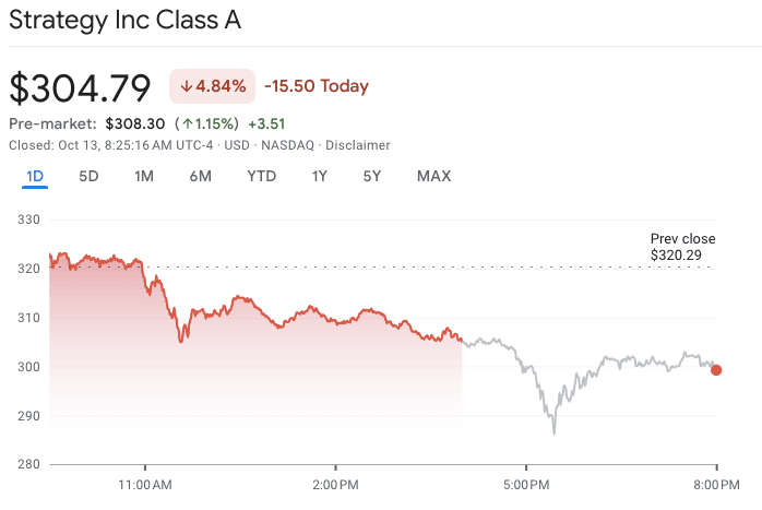Following the announcement, Strategy Inc.’s Class A shares dropped by 4.84%, closing at $304.79. The stock had fallen from a previous close of $320.29, testing intraday support near $285 before rebounding modestly. However, pre-market trading showed a slight recovery of 1.15% to $308.30, indicating early signs of stabilization.