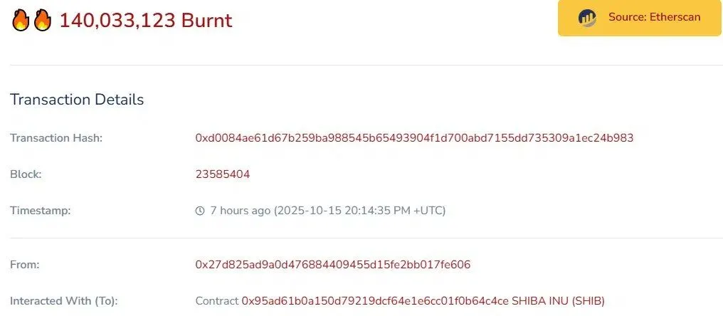 According to data shared by the community-driven tracker Shibburn, an anonymous user transferred 140,033,123 Shiba Inu (SHIB) tokens to a dead wallet in a single transaction. The burn took place at approximately 20:14 UTC on October 15. Blockchain records show that the wallet responsible for the transfer, identified as 0x27d…fe606, was newly created and has only executed one transaction — the 140 million SHIB burn.