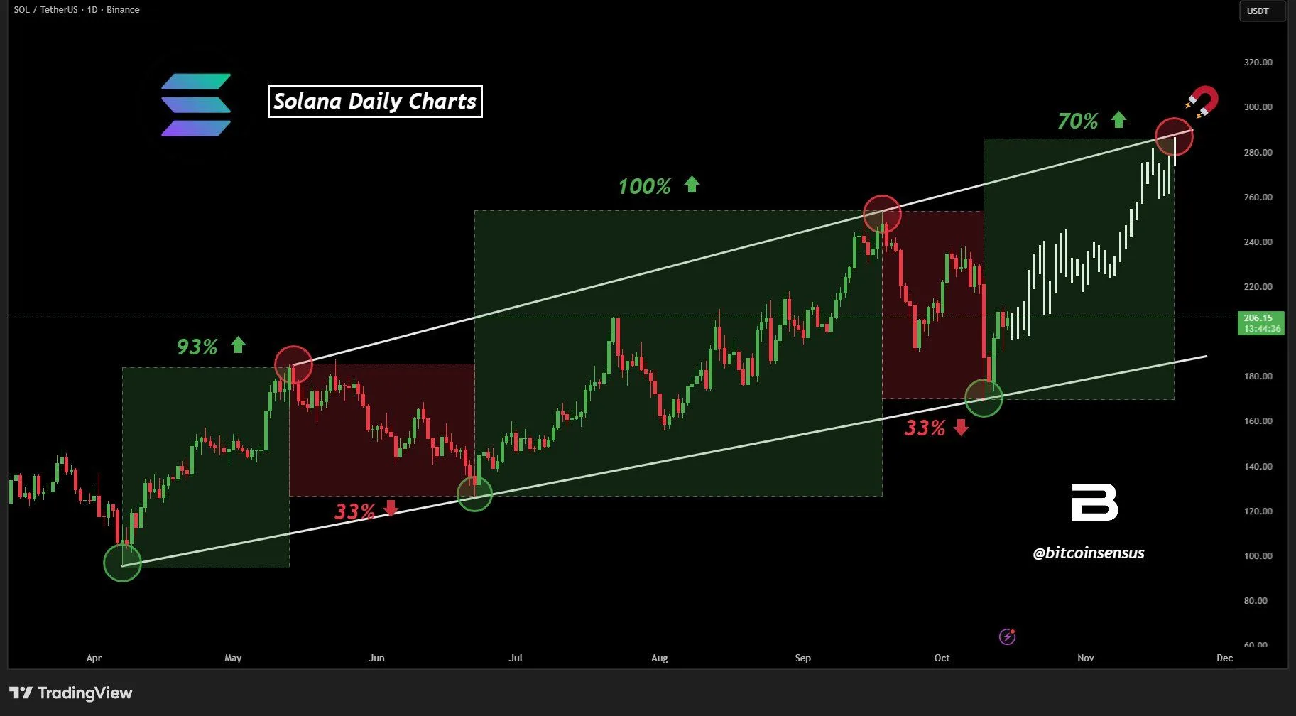 According to Bitcoinsensus, the asset has a history of rebounding sharply after 33% drops, often leading to 93% to 100% rallies. SOL is currently rebounding from a channel support near $180, with potential upside targets between $280 and $300 if momentum continues.