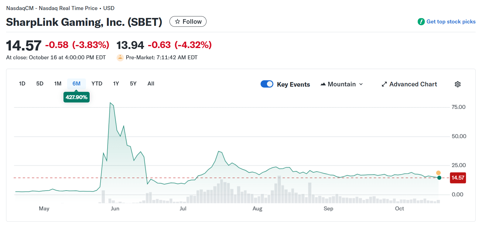 SharpLink’s shares rose 2% to $15.45 in morning trading but later eased to $14.57 at the time of writing, data from Yahoo! Finance shows.