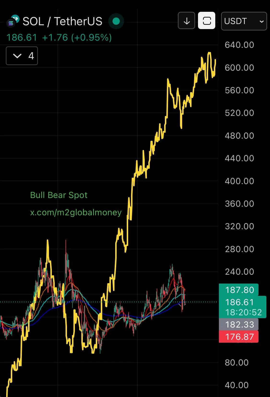 According to Bull Bear Spot, the Solana (SOL/USDT) chart compared to M2 Global Liquidity shows a strong bullish divergence. While global liquidity trends upward, Solana appears to be consolidating near a critical support zone at $176–$182.