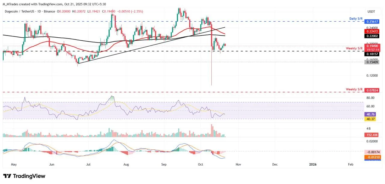 At the time of writing, DOGE traded around $0.1944. The price remained under pressure despite the weekend bounce. Technical indicators reinforced the negative outlook. The Relative Strength Index (RSI) on the daily chart read 40. This sits below the neutral 50 level. The reading indicates bearish momentum controls price action.