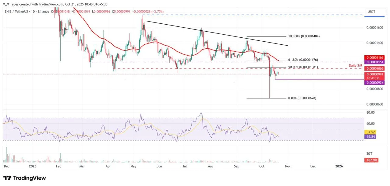 If the correction deepens, SHIB could test Friday's low at $0.0000092. This level represents a critical support zone. Failure to hold could trigger accelerated selling as stop-loss orders activate.
