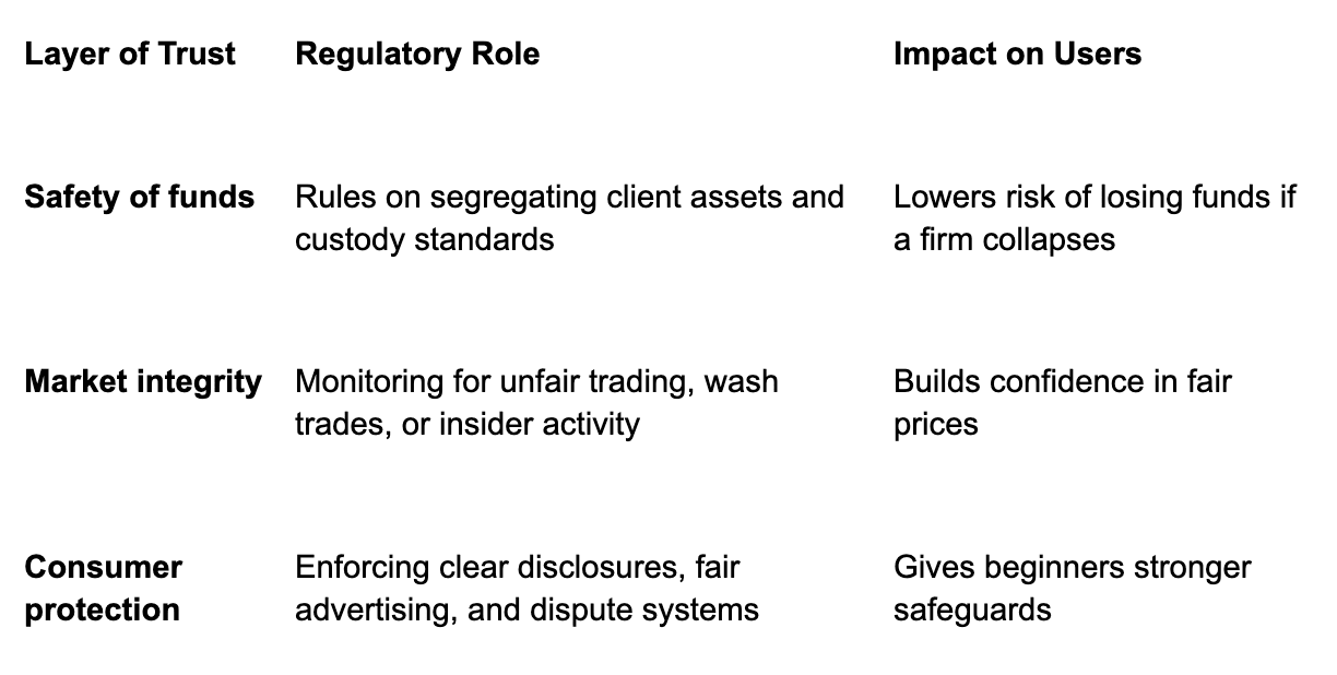 For traders, regulation acts like a safety net. Most people will not study long custody reports or compliance papers. Instead, they look for simple signals: is the broker licensed, registered, or supervised by a trusted authority?