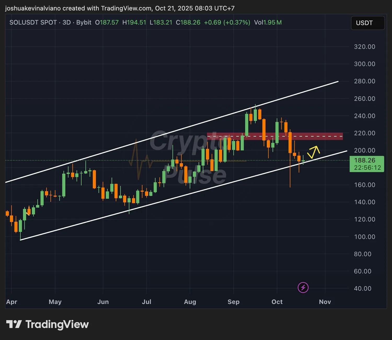At press time, Solana traded near $186.40, down nearly 3% over the past 24 hours. Analyst platform CryptoPulse noted that SOL is retesting its long-standing ascending trendline near $185, which has repeatedly served as strong support.