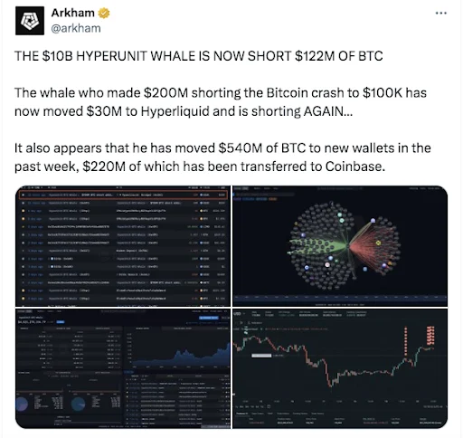 Data from Arkham shows that the whale recently transferred $540 million worth of BTC to new wallets, including $220 million to Coinbase. He also sent $30 million to Hyperliquid, the platform where he placed the short position.