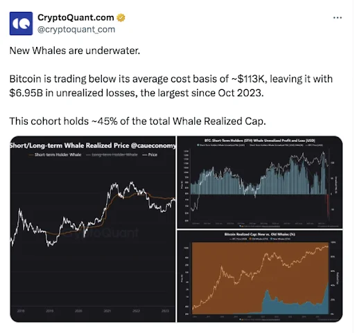 Now, newer large holders are also under pressure. CryptoQuant estimates that this group faces a collective unrealised loss of $6.95 billion after Bitcoin slipped below its average cost basis of $113,000.