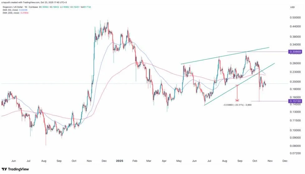 According to market analysts, the coin may retest its support at $0.1515, which was its price on October 10 as the wider crypto market entered a selling frenzy. This would represent a 22% decrease from the current levels.