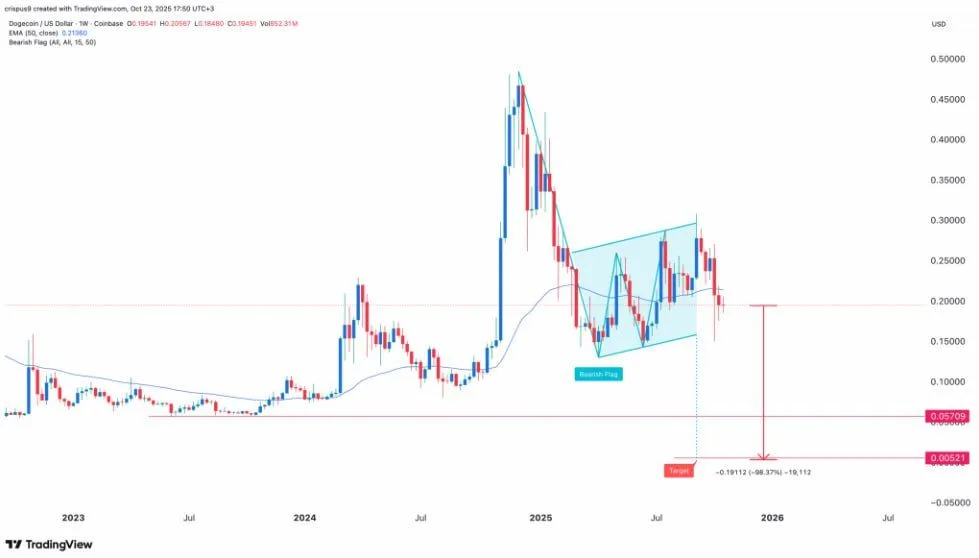 The timeframe of the week presents an even gloomier picture. Dogecoin has already developed a bearish flag, characterized by a vertical decline between the positions of $0.4838 and $0.1295, and an upward channel.