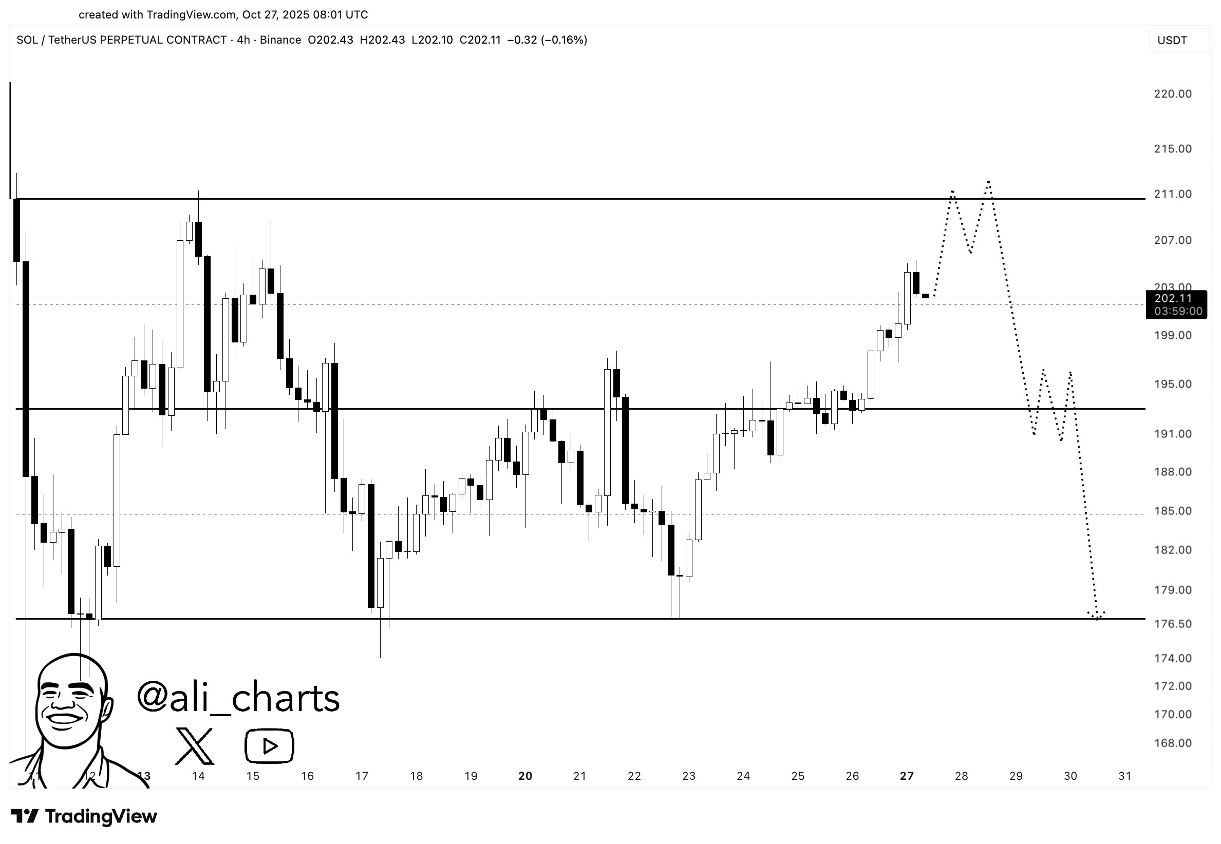 Market analyst Ali Martinez observed that Solana could push toward the $210 level before entering its next consolidation phase. The token has shown strong support near $191, where buyers consistently re-enter. A decisive break above $210 could open the door to higher targets, while a drop below $191 might test $176.