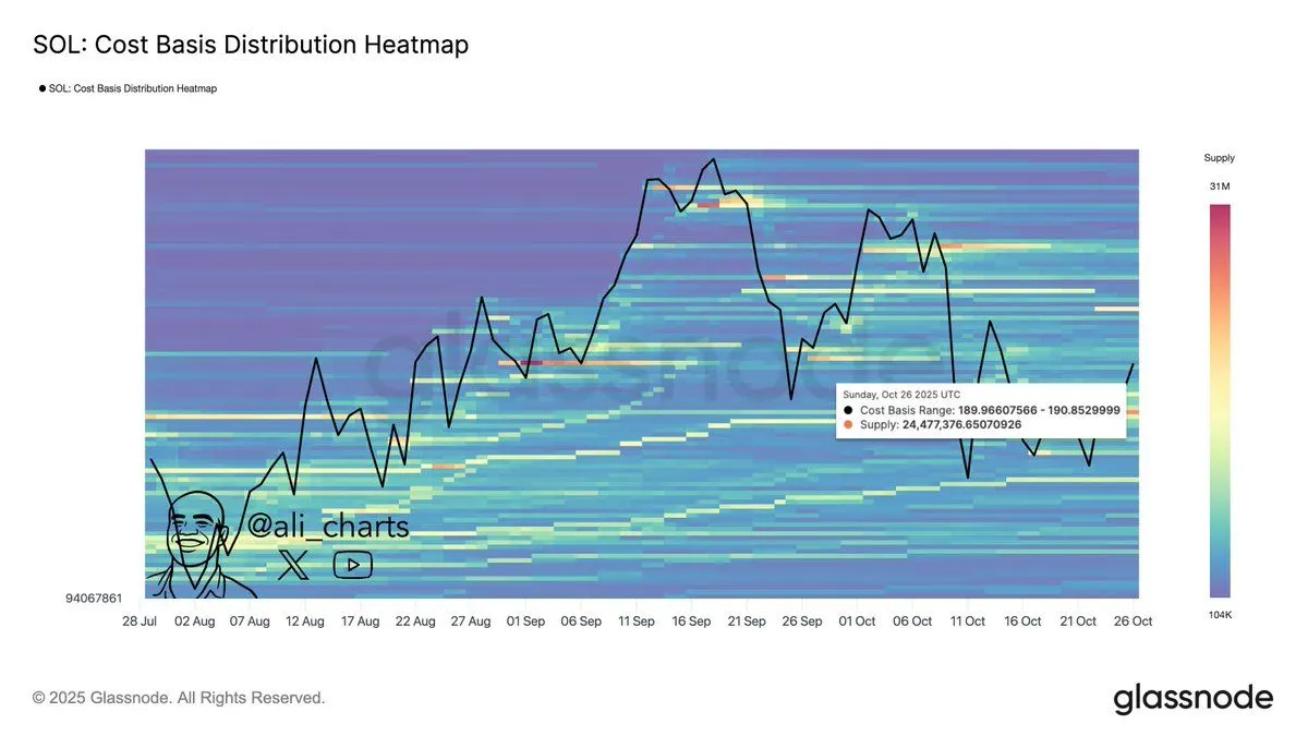 On-chain data, according to Ali Martinez, shows a strong accumulation zone around $189, where 24.5 million SOL were purchased. This cluster forms a key support region likely to prevent deeper corrections. Holding above that threshold could reignite buying momentum toward $210 and $225.
