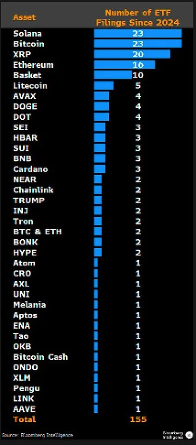 Currently, there are about 20 XRP ETF filings pending with the U.S. Securities and Exchange Commission (SEC), trailing slightly behind Bitcoin and Solana, which each have 23 filings, while Ethereum has 16 filings pending, according to Bloomberg Intelligence ETF analyst Eric Balchunas.