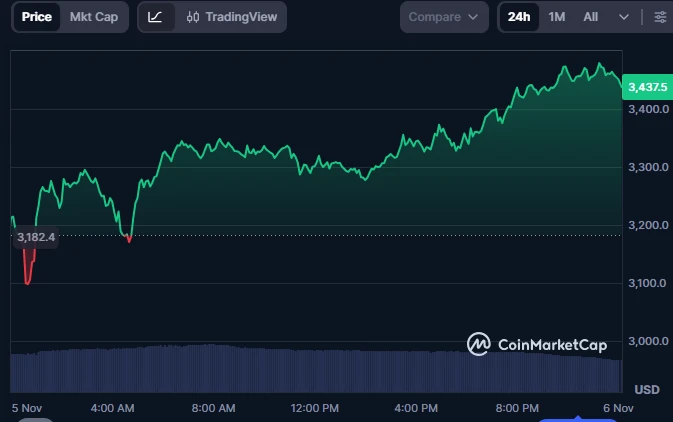 The cryptocurrency market experienced a dramatic downturn as Ethereum collapsed below $3,300 before increasing by 7.6% in the last 24 hours to around $3,436.98 at press time.