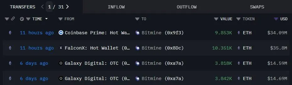 According to recent blockchain data from Arkham Intelligence, two major transactions were made to BitMine wallets within 24 hours. Coinbase Prime and FalconX transferred over 19,000 ETH, worth $69.89 million, to the firm. Six days ago, the over-the-counter desk at Galaxy Digital transferred approximately 6,000 ETH, valued at $29.28 million, to BitMine addresses.
