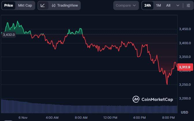 At the time of writing, Ethereum is trading at around $3,312, suggesting a 3.48% decline in the last 24 hours.