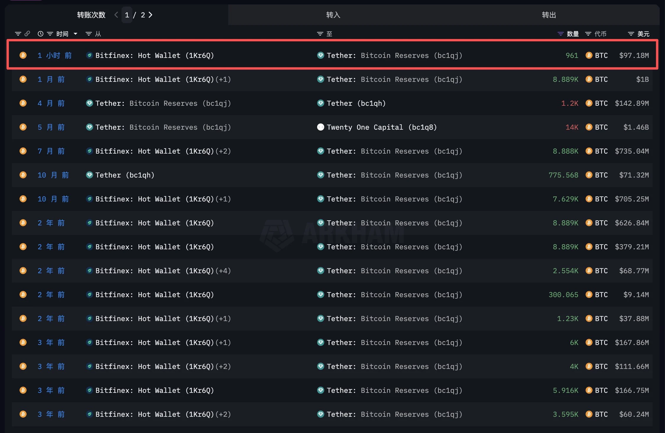 The company has transferred the funds from Bitfinex's hot wallets to its dedicated Bitcoin reserve address. Arkham Intelligence monitored the movements, which occurred in two stages. The first transaction involved the transfer of 961 BTC, valued at $97.18 million. A subsequent transfer brought 8,888 BTC, worth roughly $1 billion, into Tether's reserves.