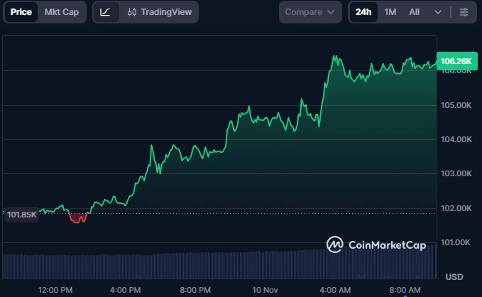 Bitcoin surged above $106,000 on Monday as the US Senate moved forward with legislation to end the historic government shutdown. At the time of writing, the leading cryptocurrency is trading at around $106,274, indicating a 4.38% increase in the last 24 hours.