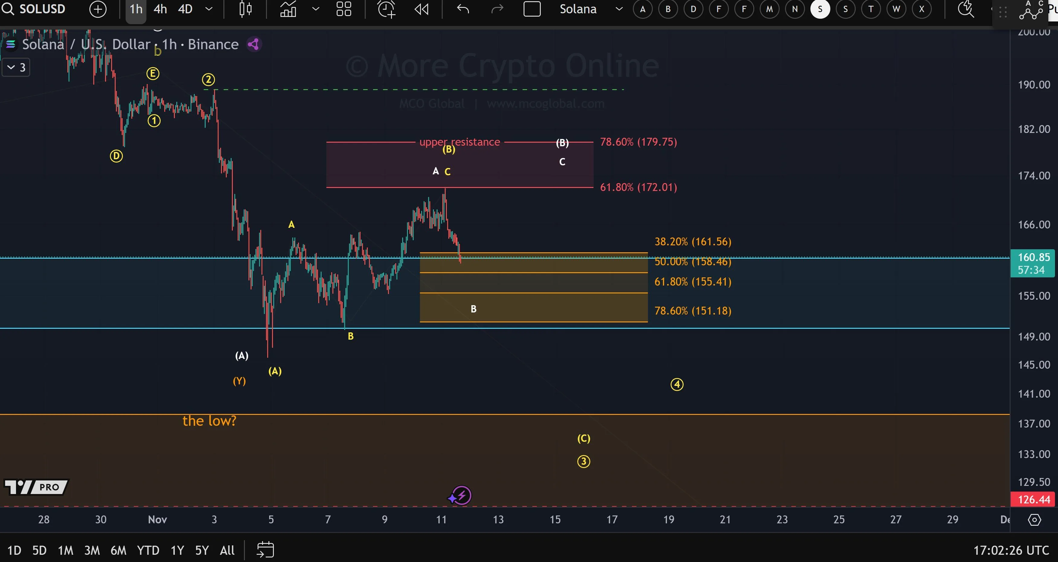 Meanwhile, Solana (SOL) trades at $158.33, marking a 4.94% daily drop but a 1.21% weekly gain. More Crypto Online analysis shows SOL is testing a crucial support zone between $158 and $155, defined by Fibonacci retracements. A rebound above $161 could drive a move toward $172–$179. However, a dip below $151 might signal further decline toward $145.