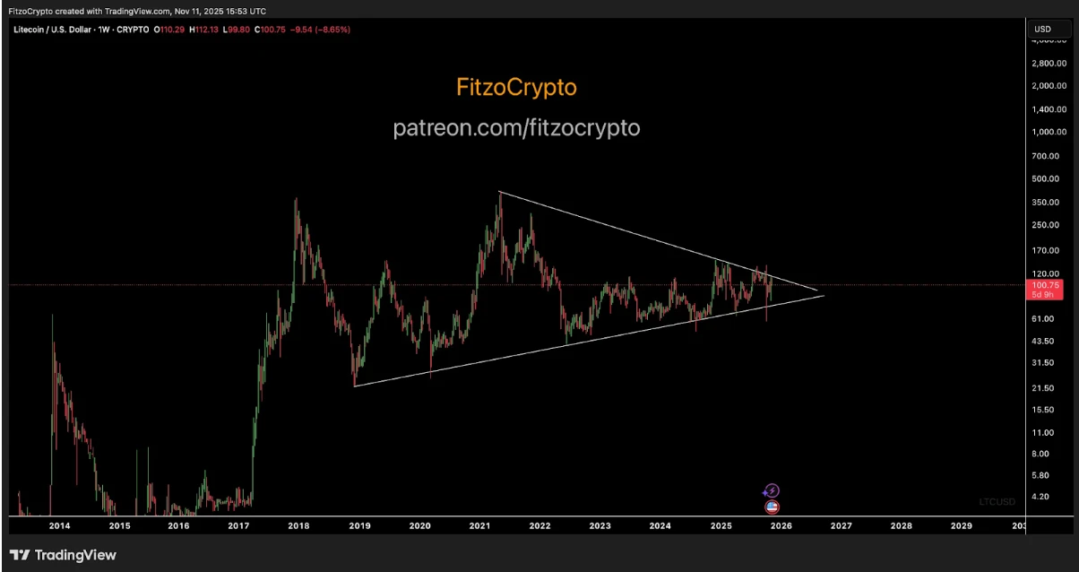 Litecoin has spent several years inside a large bull pennant that has shaped its price since 2018. Each rally has stopped at the same resistance line, but this time, momentum looks stronger. According to market analyst “Fitzo Crypto”, this symmetrical triangle could break soon, a move that could drive a parabolic rally for Litecoin.
