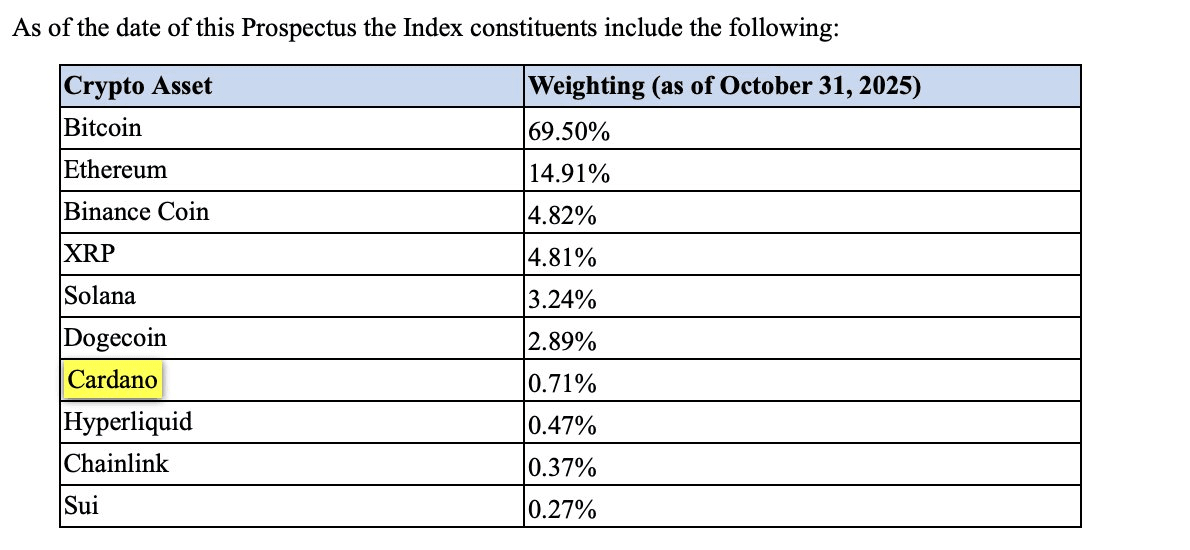 According to the prospectus snapshot shared today, the index lists ADA among its constituents with a 0.71% weighting as of Oct. 31, 2025. Meanwhile, larger weights sit with Bitcoin and Ethereum, while other components include Binance Coin, XRP, Solana, Dogecoin, Hyperliquid, Chainlink, and Sui.