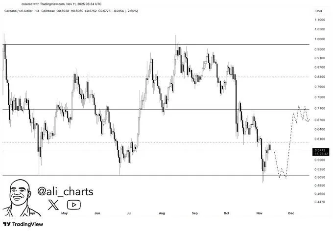 Analyst Ali shared a chart on X showing that Cardano (ADA) must hold $0.50 to maintain its recovery potential toward $0.70. The daily chart from TradingView highlights a clear range, with ADA trading near the lower boundary after a recent decline.