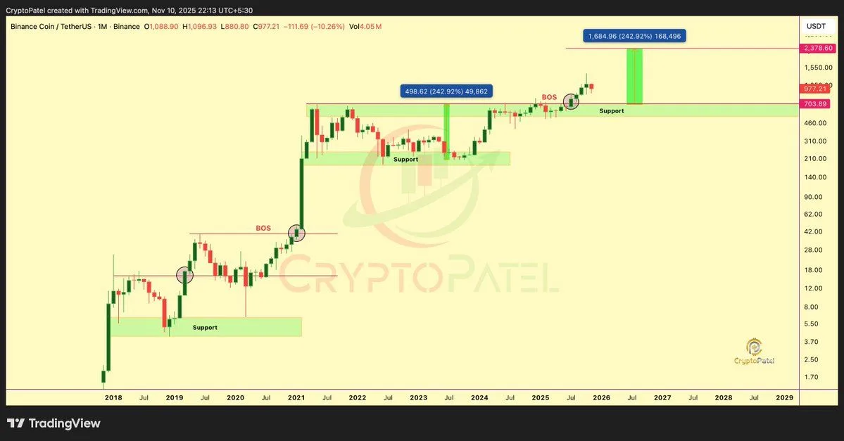 The analysis outlines a potential upside target above $2,300 based on the size of the earlier rally projected from the new support area. The monthly view highlights prior consolidation phases that turned into support before each major advance. However, the scenario depends on BNB holding the $700 region and sustaining momentum on higher timeframes.