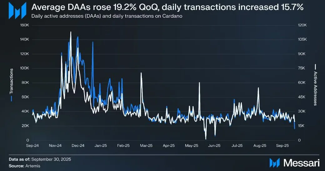 In Q3 2025, the Cardano network recorded a 19.2% increase quarter-on-quarter in average daily active addresses. At the same time, daily transactions rose by 15.7%.