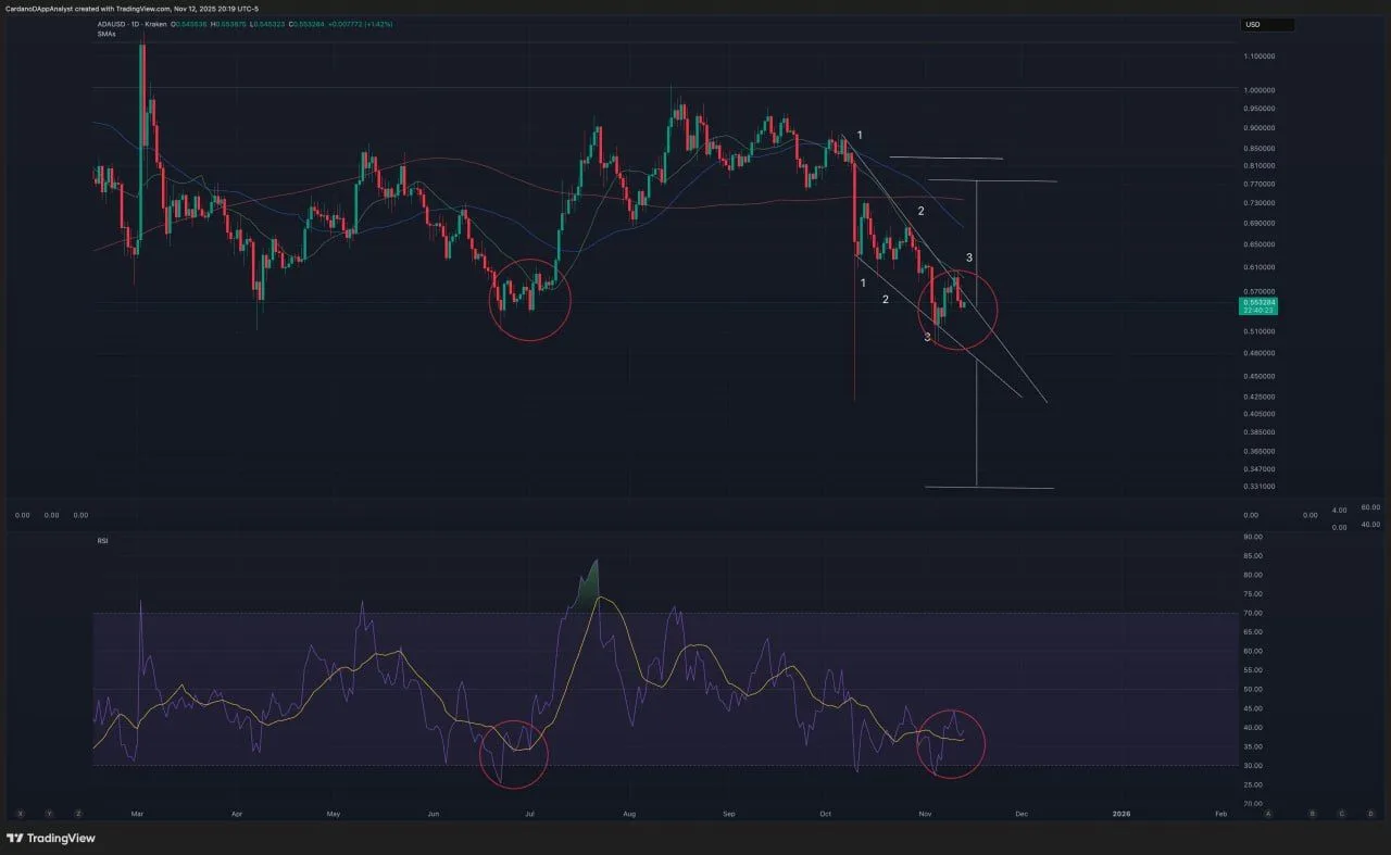 At the same time, his chart shows a falling wedge pattern on the daily timeframe, with price moving between two converging downward trendlines. The setup places ADA near the middle of the structure while RSI turns higher from low levels, hinting that selling pressure may be easing.