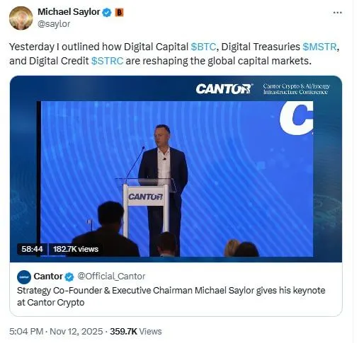 Michael Saylor used his keynote at the Cantor Crypto & AI/Energy Infrastructure Conference in Miami to outline how he sees Bitcoin entering a new stage of adoption. He called 2025 a turning point as large financial institutions expand custody products, collateral services and ETF exposure. He said these developments shift Bitcoin from a niche asset toward what he described as a form of digital capital used inside major markets.