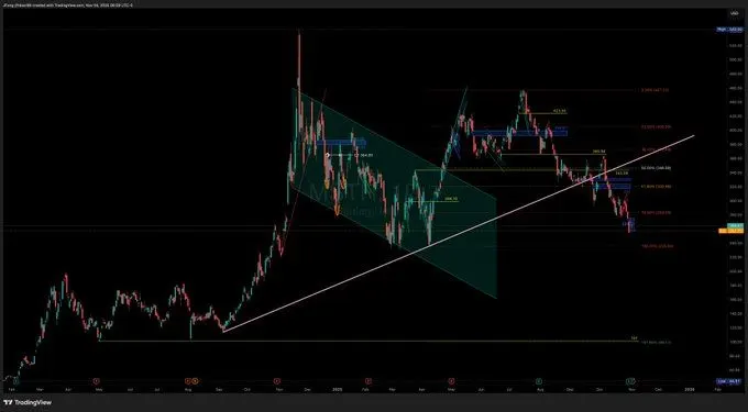 The chart shows MSTR’s strong advance from its earlier lows, followed by a sharp reversal and a break below a long-running uptrend line. The price now sits under that former support while Fibonacci retracement levels mark potential areas where the stock could pause or bounce. The layout suggests that the prior rally phase has given way to a corrective structure that leans lower.