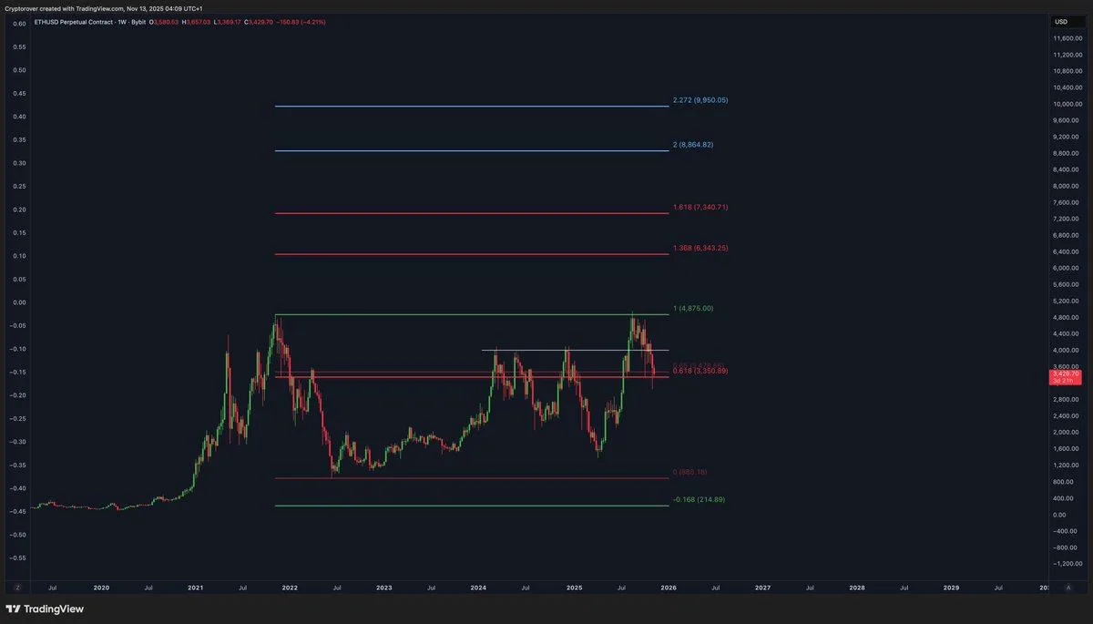 The chart shows ETH retreating from resistance near $4,875, which lines up with the 1.0 Fibonacci extension. As price slid lower, it returned to the $3,350–$3,450 band, a zone that marks the 0.618 retracement from the previous rally. This level has served as a structural support base over the past two years, reinforcing its significance on long-term timeframes.