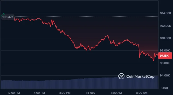 At press time, Bitcoin is trading at $97,184, suggesting a 6.34% decline in the last 24 hours.