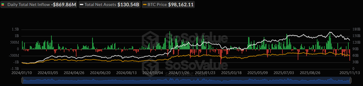 U.S. spot bitcoin exchange-traded funds recorded $869.9 million in net outflows on Thursday, representing the second-largest withdrawal since these investment vehicles launched. The mass exodus reflects growing caution among investors as the price of bitcoin declined sharply.
