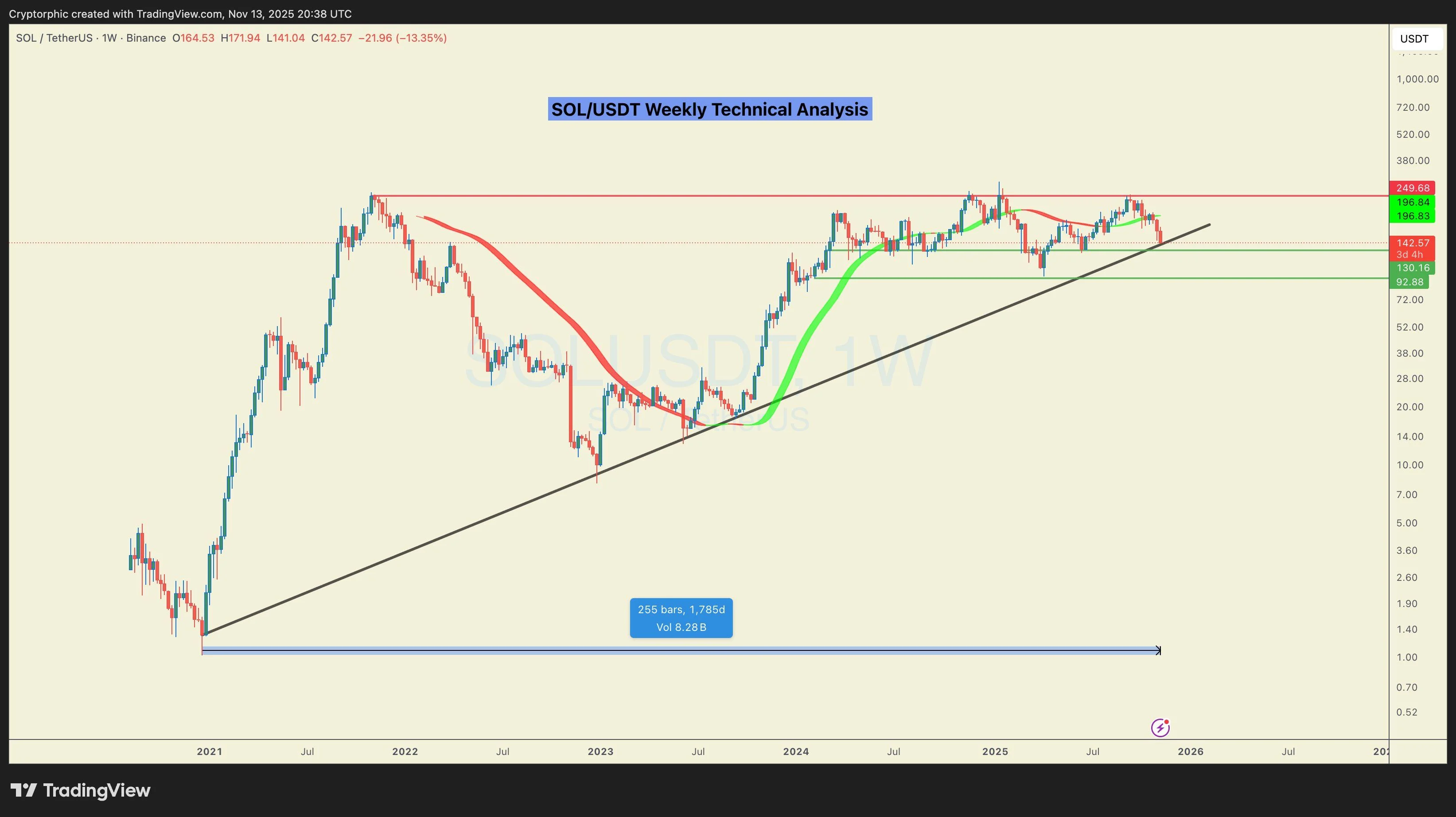 This area has anchored the entire recovery since 2020. A rebound here may send price toward $196 and $249. However, a weekly close below $135 may expose deeper weakness toward $93. The current reaction will guide Solana’s long-term structure and shape its position in the ETF-driven market cycle.