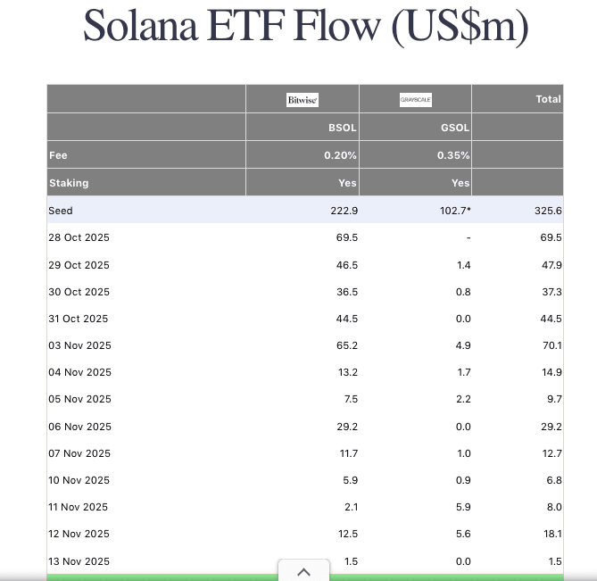 Activity is not limited to U.S. products. Grayscale’s GSOL ETP also records heavy trading, despite losing roughly 30% during the past month. Since BSOL began trading on October 28, net flows into the two active Solana funds have reached about 370 million dollars, with nearly 200 million dollars arriving during the first week.