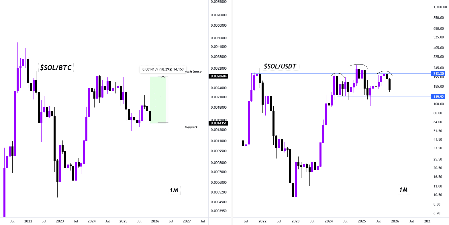 However, the SOL/USDT monthly structure presents a different picture. A clear Head and Shoulders pattern has developed, with a neckline positioned around $119 to $120. Analysts described this area as a pressure point because a monthly close beneath it confirms a larger corrective phase.