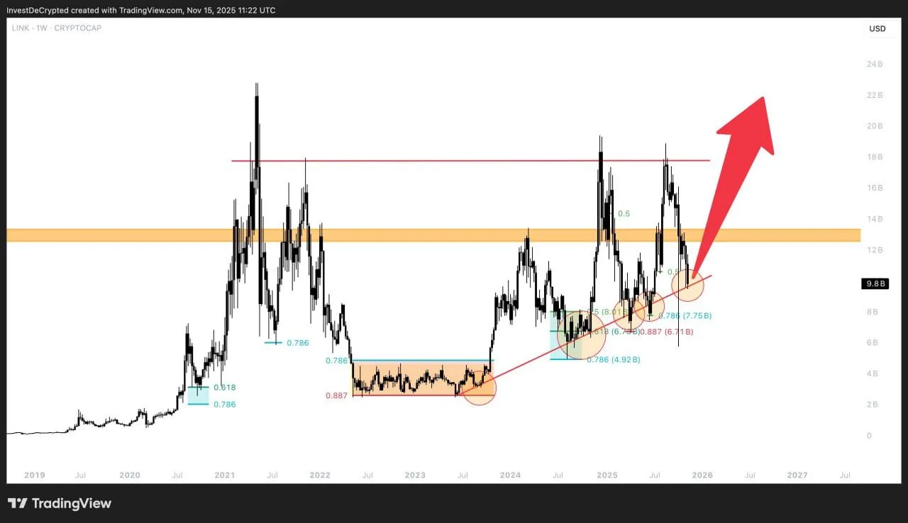 Then Chainlink’s market-cap chart has once again slipped into its rising trendline, a level it has tested multiple times over the past two years. Analyst Investing DeCrypted notes that the structure mirrors earlier retests that preceded strong upside swings, placing fresh attention on whether LINK can hold this higher-timeframe support.