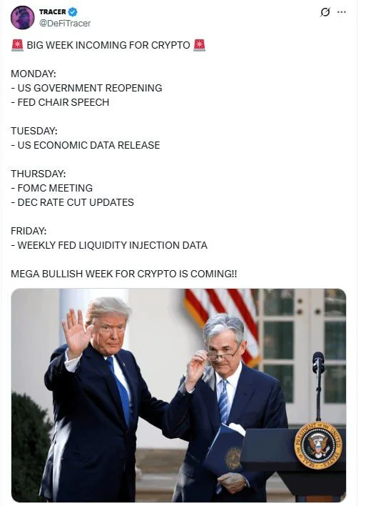 Now crypto markets head into one of their heaviest macro weeks of the year, with Washington reopening and the Fed back in focus. This mix of fresh economic data, rate-cut signals and shifting liquidity is already feeding into Bitcoin’s slide and broader risk sentiment.