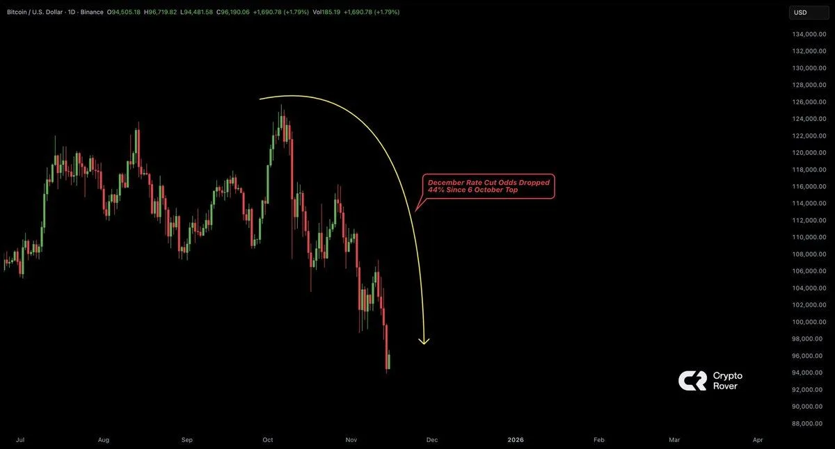 Now Bitcoin faces renewed pressure as traders scale back expectations for a Federal Reserve rate cut in December. Odds for a move at the final meeting of the year have fallen about 44 percentage points since their early October peak, according to chart data shared by analyst Crypto Rover. The shift comes while the central bank signals it will keep borrowing costs elevated until inflation slows more convincingly.