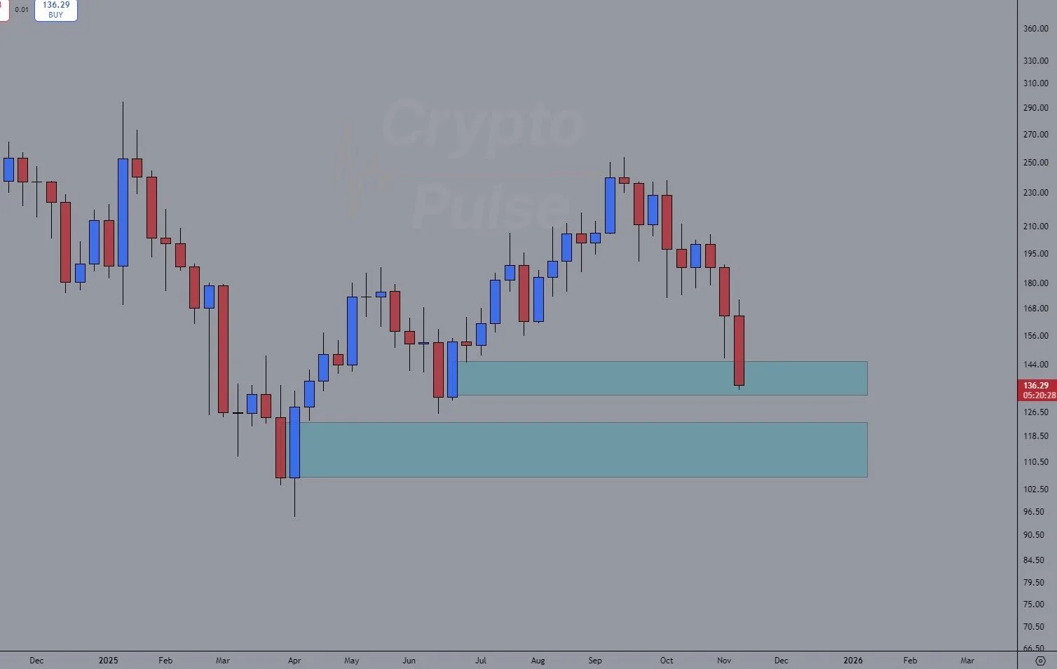 CryptoPulse highlighted a broader weekly perspective. Solana now tests the first major high-volume support zone near $135–$145. A deeper zone sits between $118 and $126. A sweep of the lower area would reset the structure and potentially prepare for a stronger rally. Besides, this area created major trend pivots during earlier cycles.