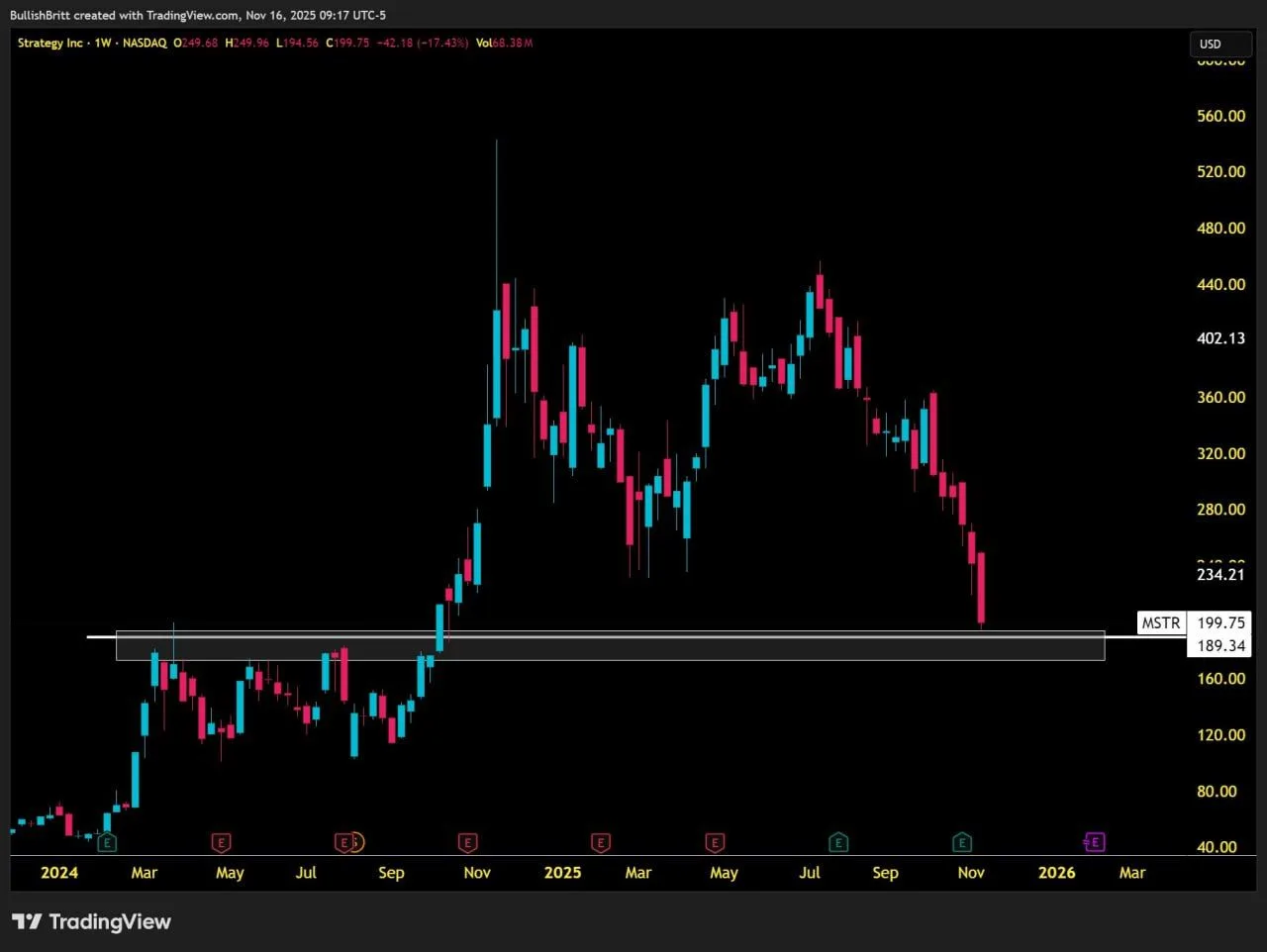 Now BRITT describes MSTR as her “top watch” for the week, saying she expects the former supply area to act as support and form a demand zone on this retest. In her view, the highlighted region marks a level where the stock paused and reversed multiple times in the past, which could attract fresh buyers if the zone holds. The chart shows price pressing into that band with elevated weekly volume, underscoring how much trading activity is clustering around the level.