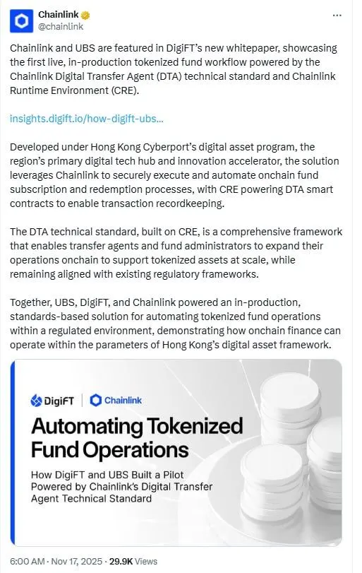 Chainlink and UBS appear in a new DigiFT white paper that describes what it calls the first live, in-production tokenized fund workflow using Chainlink’s Digital Transfer Agent (DTA) technical standard and Chainlink Runtime Environment (CRE). The pilot runs within Hong Kong’s digital asset framework and focuses on automating core fund processes onchain.
