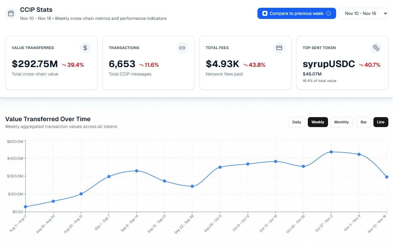 Meanwhile, Chainlink’s Cross-Chain Interoperability Protocol (CCIP) posted a clear slowdown in activity for the week of November 10–16. Data shared by analyst Tomb shows total value transferred falling to $292.75 million, a 39.4 percent drop from the previous week.