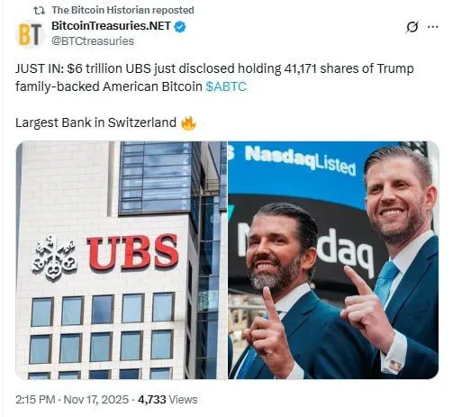 UBS Discloses Stake in Trump-Backed American Bitcoin Corp