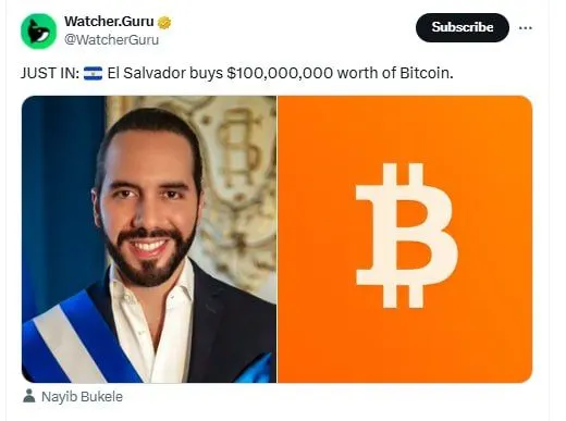 El Salvador 100 Million Bitcoin Buy. Source: Watcher.Guru